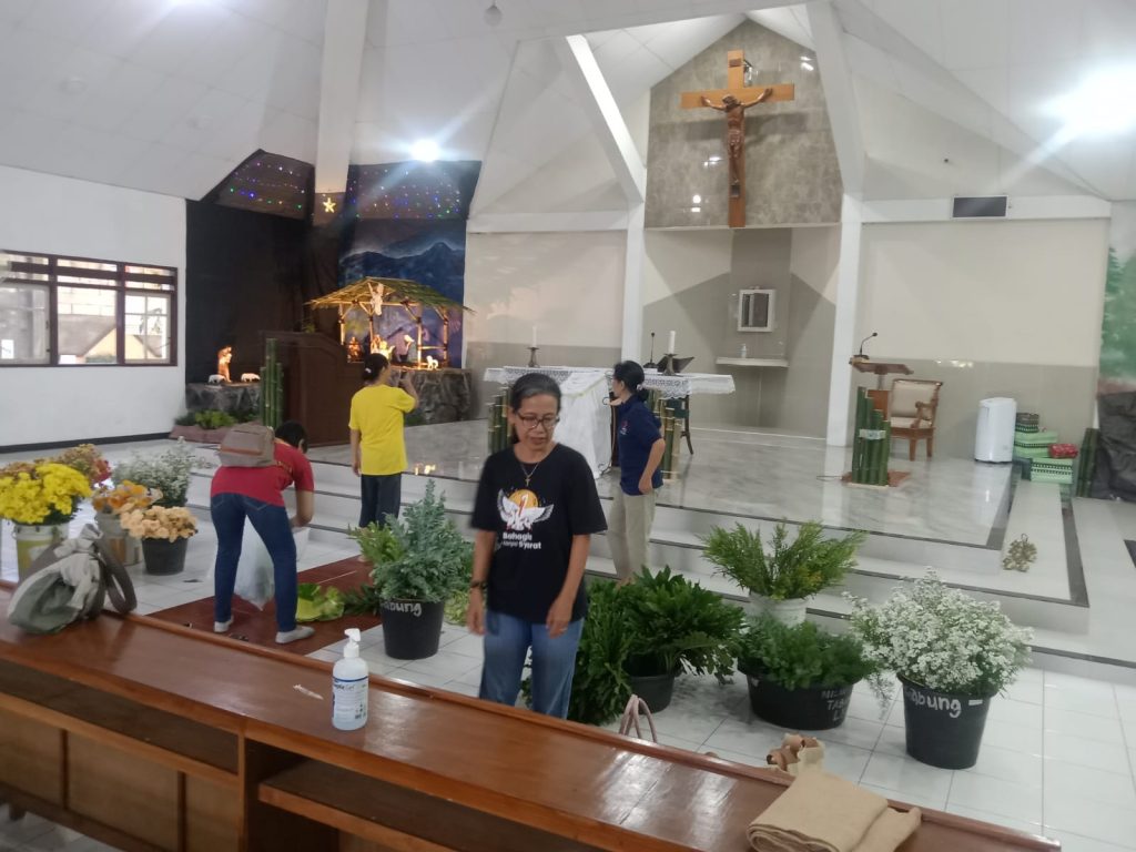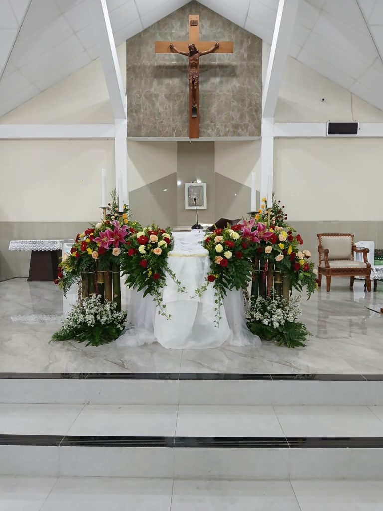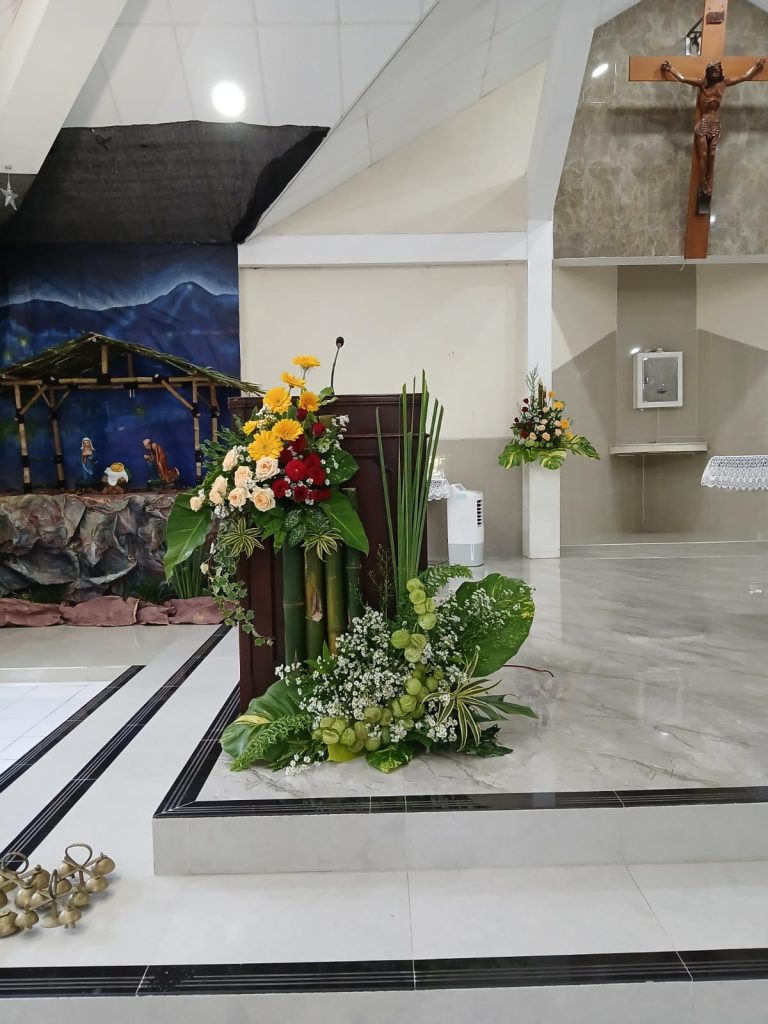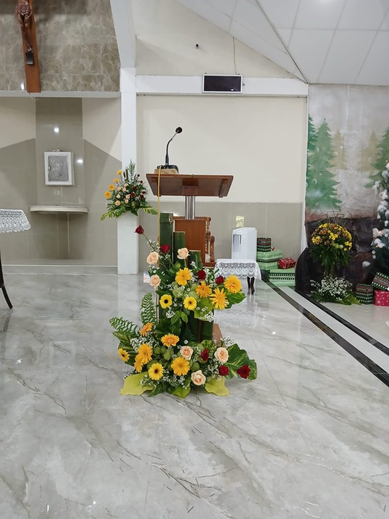 Saat umat melangkah memasuki gereja, suasana Natal langsung terasa berbeda. Rangkaian bunga yang menghiasi altar dan sudut-sudut gereja menghadirkan kedamaian yang dalam, seolah mengajak setiap hati untuk hening dan bersujud. Gereja terasa seperti surga kecil di bumi, tempat umat merasakan kehangatan kasih Allah yang hadir melalui perayaan Natal.