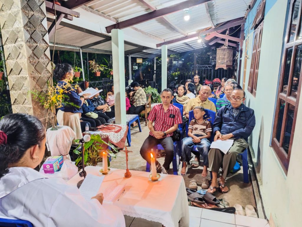 Sukacita Paskah terasa begitu hangat dalam kebersamaan umat Lingkungan Santa Monica yang menggelar ibadah Paskah pada Kamis, 9 April 2026. Bertempat di rumah Bapak Saman, ibadah yang dimulai pukul 19.00 WIB ini dipimpin oleh prodiakon Ibu Wiwiek dan dihadiri oleh umat dalam jumlah yang cukup banyak.